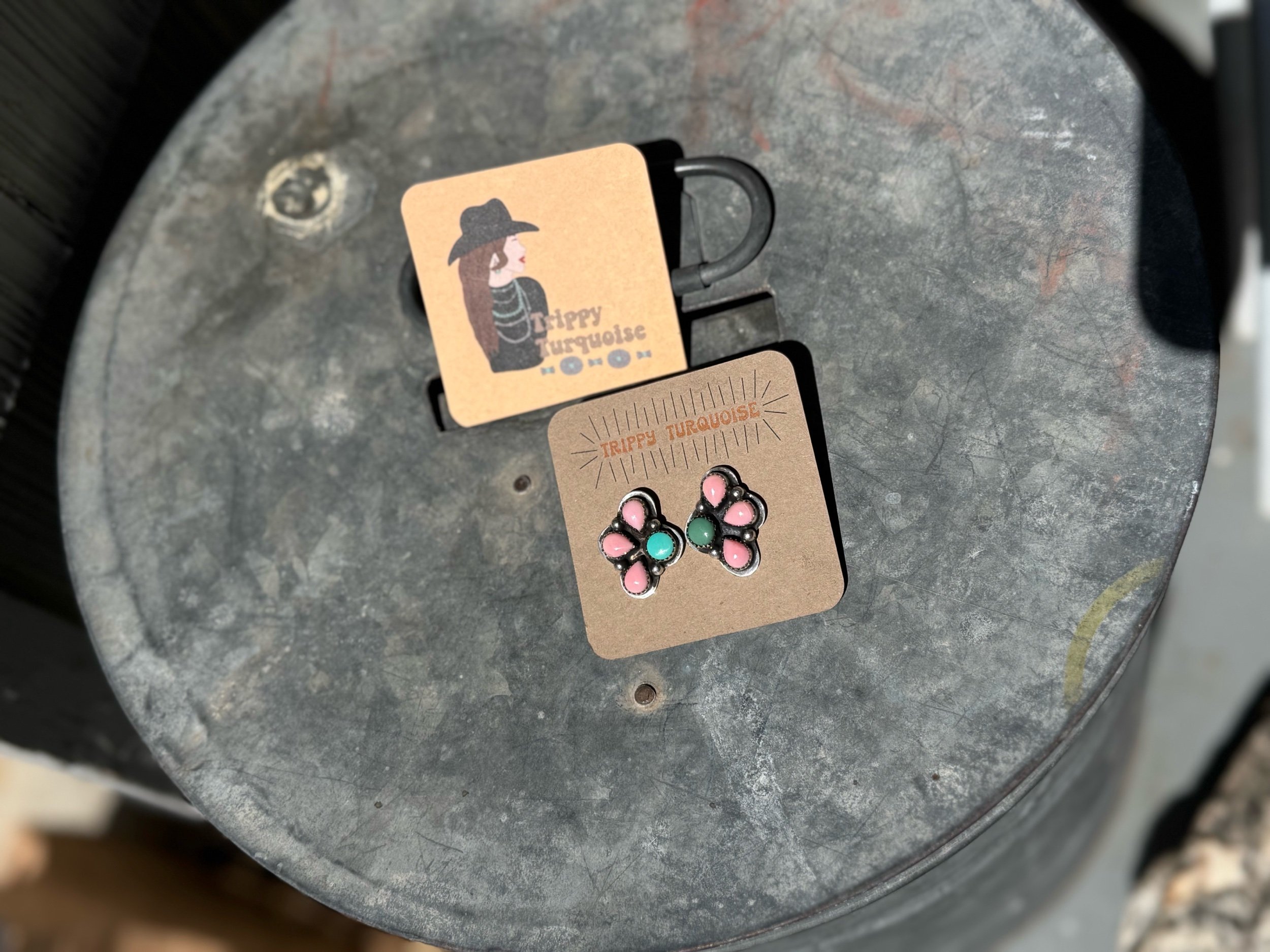 Image 1 of 1 TT Sterling Silver Pink conch/turquoise cluster earrings $180.00 TT handmade Sterling Silver Pink conch/turquoise cluster earrings they’re 1” tall Add To Cart Added! TT handmade Sterling Silver Pink conch/turquoise cluster earrings they’re 1” tall